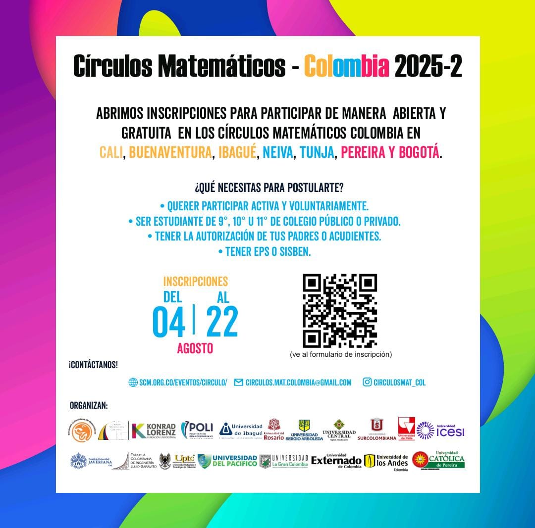 La Escuela de matemáticas y estadística de la UPTC Tunja, junto con la sociedad Colombiana de matemáticas está organizando los Círculos matemáticos versión 2025-2, es así que tenemos el gusto de compartir con ustedes la información del evento. Las inscripciones van hasta el 22 de agosto en el enlace https://scm.org.co/web/circulos-matematicos-colombia/. No olvides que la actividad es completamente gratuita, solo debes contar con el tiempo para participar